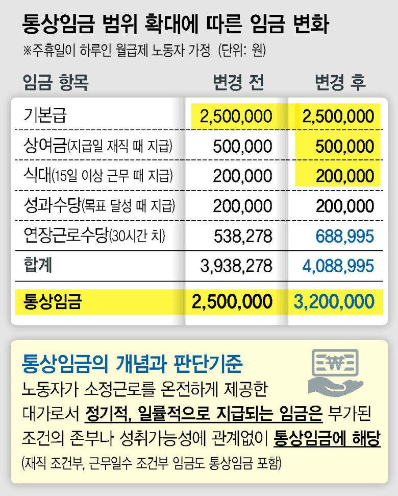 먼저 통상임금이 무엇인지 확인하고 하겠습니다. 근로기준법과 시행령에 따라 통상임금은 근로계약이나 취업규칙에 따라 노동자와 사용자가 일하기로 한 시간(소정근로시간)만큼 일한 대가로 정기적·일률적으로 지급되는 임금을 말합니다. 쉽게 말해 통상적으로 일했을 때 받는 임금입니다. 통상임금은 연장·야간·휴일근로수당(가산수당)을 지급하는 기준이 되기 때문에, 연장·야간·휴일근로가 일상인 한국에서는 그 범위를 두고 논란이 많았습니다. 상여금이나 식대·교통비 등이 통상임금에 해당하느냐 같은 논란이죠. 그런데 지난해 12월 대법원 전원합의체는 소정근로의 대가로서 정기적·일률적으로 지급되면 모두 통상임금에 해당한다고 판결했습니다. 원래는 일정 일수 이상 일해야 하거나, 임금을 지급하는 날에 근무해야 하는 ‘조건’이 붙어있는 임금은 통상임금에 해당하지 않았는데, 이런 상여금·수당도 통상임금에 포함된다는 것입니다.