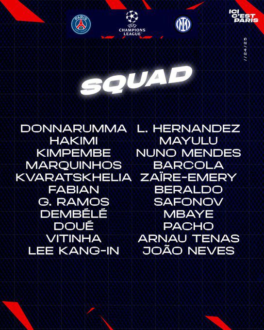 PSG는 구단 공식 홈페이지를 통해 "UEFA 챔피언스리그 결승전을 위한 선수단. 인터밀란을 상대로 경기를 펼칠 선수 22명이 확정됐다"고 알렸다.