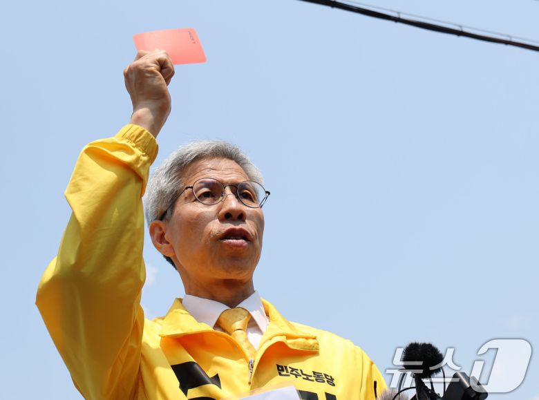권영국 민주노동당 대통령 후보가 29일 오전 광주 광산구 금호타이어 광주공장 앞 정문에서 이준석 후보의 발언에 대해 레드카드를 들고 경고하고 있다. 2025.5.29/뉴스1 ⓒ News1 박지현 기자 |