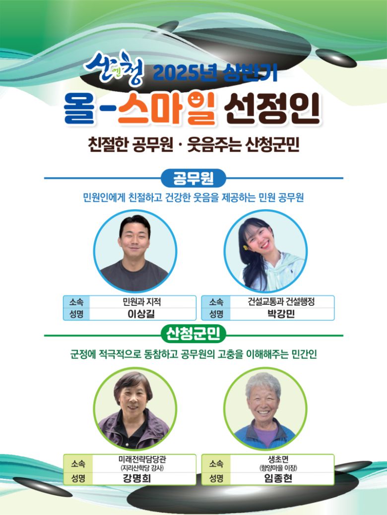 산청군은 ‘2025년 상반기 올-스마일 민원 공무원과 민간인’을 선정했다.