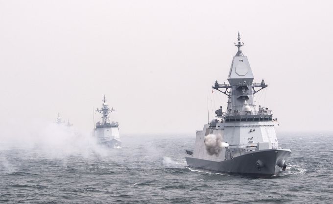 [서울=뉴스핌] 박성준 기자 = 25일 서해상에서 진행된 제10회 서해수호의 날 계기 전 해역 해상기동훈련에서 2함대 호위함과 유도탄고속함이 대함 일제사격을 하고 있다. [사진=해군] 2025.03.26 parksj@newspim.com |