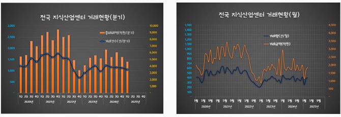 전국 주요 지역의 지식산업센터 거래금액도 위축됐다. 예컨대 전국 기준 월별 평균 거래금액은 작년 1934억원에서 올해 1559억원으로 약 20% 줄었다.