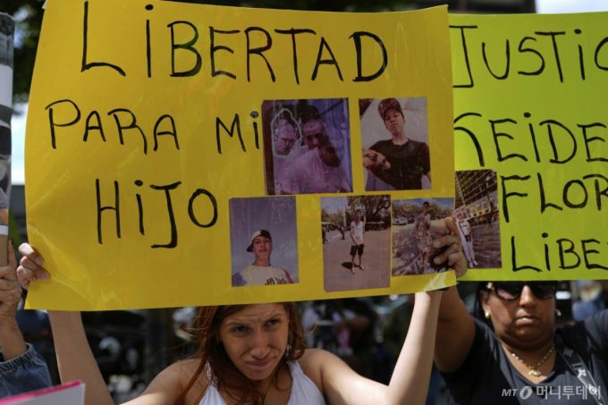 [카라카스=AP/뉴시스] 9일(현지 시간) 베네수엘라 카라카스에 있는 유엔 건물 앞에서, 미국 정부가 엘살바도르의 교도소로 강제 이송한 베네수엘라 이민자들의 가족이 항의 시위를 벌이고 있다. 미국 정부는 지난달 16일, 베네수엘라 이민자 260여 명을 '트렌 데 아라과'(TdA) 카르텔 소속이라며 재판 없이 엘살바도르의 악명 높은 세코트 교도소로 추방했다. 2025.04.10. /사진=민경찬 |
