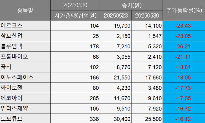 프롬바이오는 21.11% 내린 2410원, 내구소비재 업종의 꿈비는 18.81% 하락한 7120원을 나타냈다. 상업서비스 업체인 이노스페이스도 18.05% 밀린 1만7660원에 마감했다.