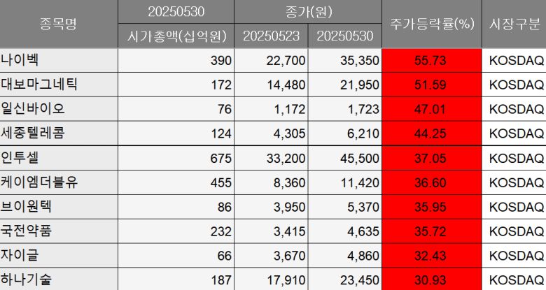 31일 한국거래소와 에프앤가이드에 따르면 지난 한 주간 코스닥 시장에서 가장 큰 상승률을 기록한 종목은 의료 장비 및 서비스 전문기업 나이벡(138610)이다. 나이벡은 55.73% 급등해 3만5350원에 거래를 마쳤다. 시가총액은 390억 원 규모다.