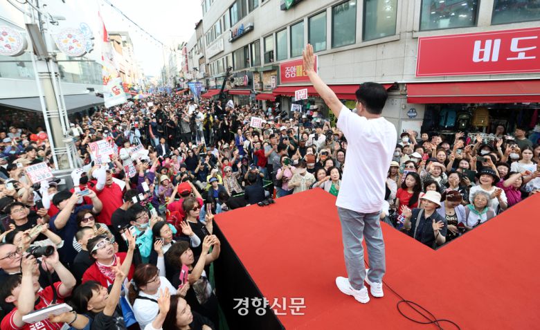 김문수 국민의힘 대선후보가 30일 오후 강원 원주시 문화의거리에서 열린 유세현장에서 시민들과 인사를 나누고 있다. 한수빈 기자 |