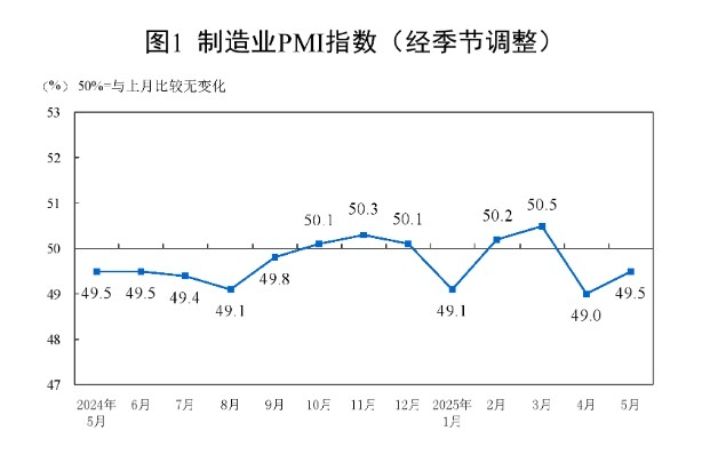 중국 국가통계국은 5월 제조업 PMI가 전월(49.0)보다 0.5포인트 상승한 49.5로 집계됐다고 31일 발표했다.