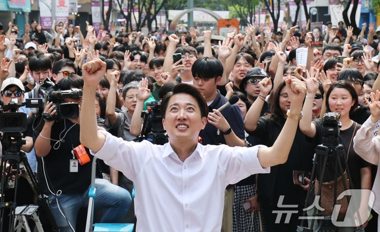 이준석 개혁신당 대통령 후보가 제21대 대통령 선거를 사흘 앞둔 31일 오후 경기 안양시 평촌로데오거리에서 열린 유세에서 막판 지지를 호소하고 있다. 2025.5.31/뉴스1 ⓒ News1 오대일 기자 |