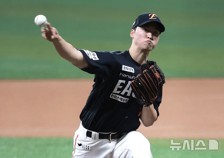 [서울=뉴시스] 정병혁 기자 = 9일 서울 구로구 고척스카이돔에서 열린 2025 KBO리그 한화 이글스 대 키움 히어로즈의 경기, 한화 선발 엄상백이 역투하고 있다. 2025.05.09. jhope@newsis.com