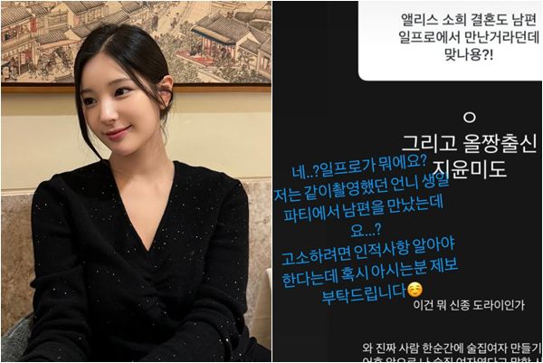 함께 공개된 사진 속에는 ‘얼짱시대’ 출신 지윤미가 누리꾼으로부터 받은 질문이 담겼다. 누리꾼은 “엘리스 소희 남편 일프로에서 만난 거라던데 맞냐. 얼짱 출신 지윤미도”라고 물었다.