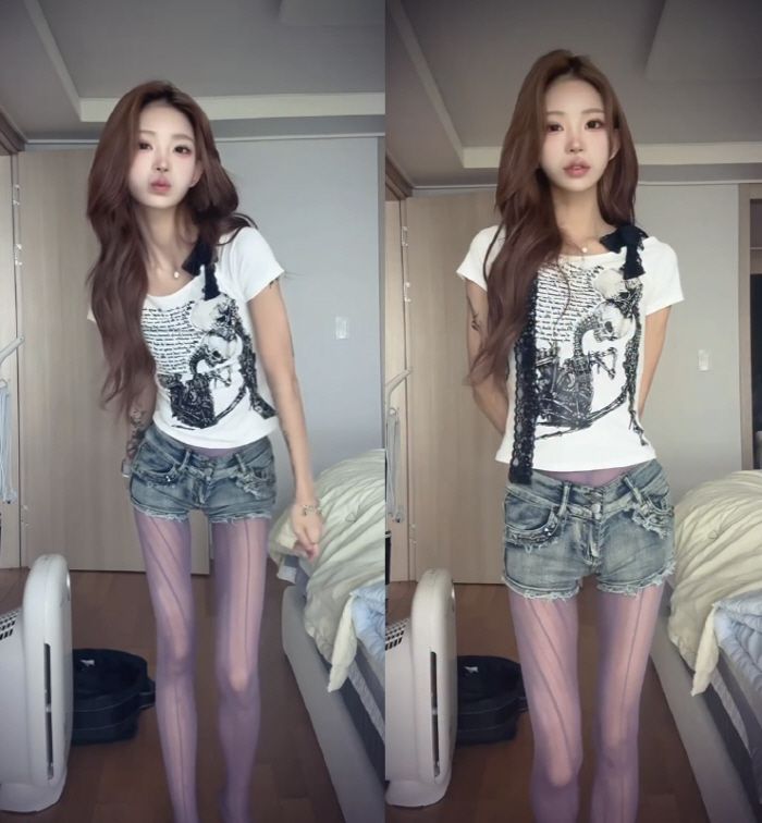 영상 속에서 최준희는 얇은 반팔티셔츠에 초미니 핫팬츠 청바지를 입고 보라빛 스타킹을 신었다.
