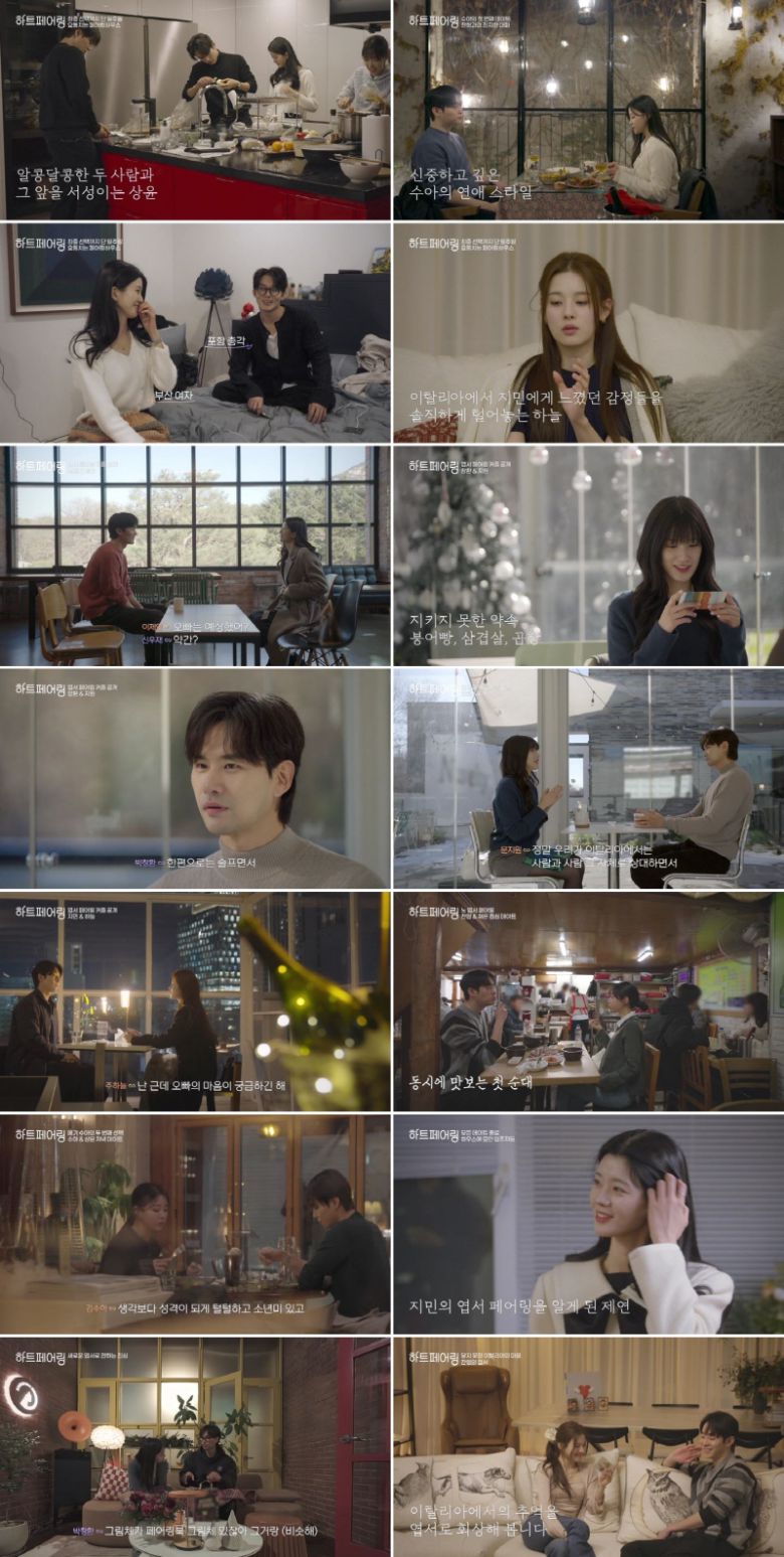 30일 방송한 채널A 연애 프로그램 ‘하트페어링’ 12회에서는 ‘서울 페어링하우스’ 입주자 10인 상윤-수아-우재-제연-지민-지원-찬형-창환-채은-하늘이 마지막 ‘계약 연애’를 종료한 후 러브라인이 요동치는 모습과 함께, 우재X제연, 지민X하늘, 창환X지원이 이탈리아에서 보낸 ‘엽서 페어링’으로 재회하며 관계의 ‘제2막’을 맞는 현장이 펼쳐졌다. 이와 함께 ‘크리스마스 데이트’를 앞둔 입주자 10인이 치열한 고민에 빠진 동시에, 최종 선택 일주일을 앞두고 더욱 커져가는 감정의 파도에 휩쓸리는 모습이 펼쳐져 몰입감을 최고조로 끌어올렸다.