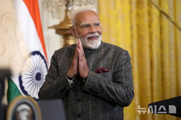 [워싱턴=AP/뉴시스] 나렌드라 모디 인도 총리가 지난 2월13일(현지 시간) 미국 워싱턴DC 백악관 이스트룸에서 도널드 트럼프 미국 대통령과 함께 기자회견을 하기 위해 도착하고 있다. 2025.05.31. |