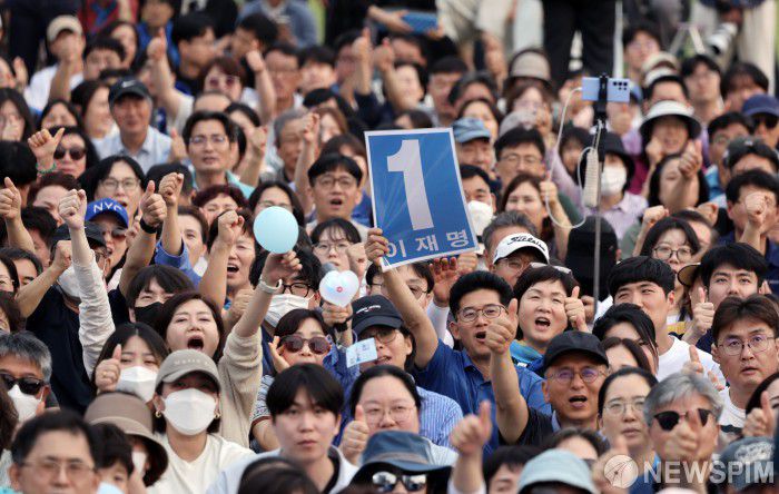 [대전=뉴스핌] 김학선 기자 = 이재명 더불어민주당 대선 후보 지지자들이 31일 오후 대전광역시 서구 보라매공원에서 환호하고 있다. 2025.05.31 yooksa@newspim.com |