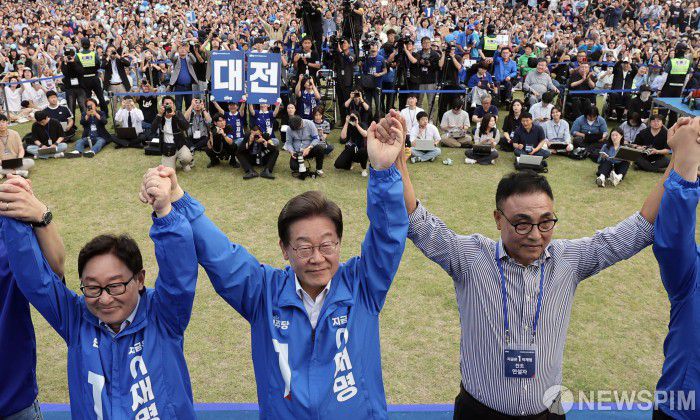 [대전=뉴스핌] 김학선 기자 = 이재명 더불어민주당 대선 후보가 31일 오후 대전광역시 서구 보라매공원에서 유세하고 있다. 2025.05.31 yooksa@newspim.com