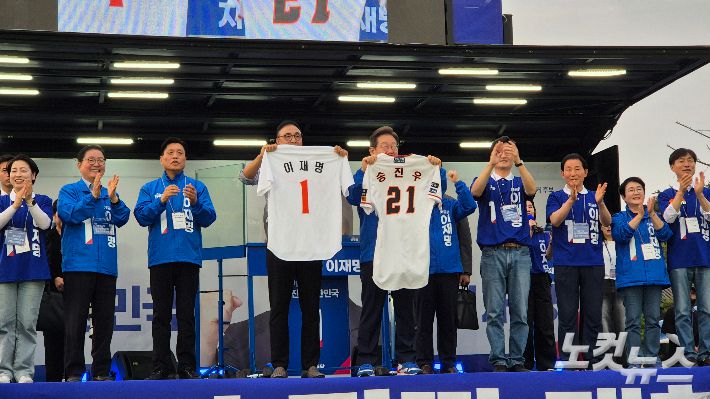 이어 이 후보는 대전으로 이동했다. 한화이글스의 전설적인 투수였던 송진우씨로부터 전달받은 한화이글스의 영구 결번 '21'번 유니폼을 입고 연단에 선 그는 "요새 (한화이글스가) 펄펄 난다면서요"라며 "영구 결번 21번 티를 주셨는데, 21대 대통령되라는 뜻 아닙니까"라고 반문했다.
