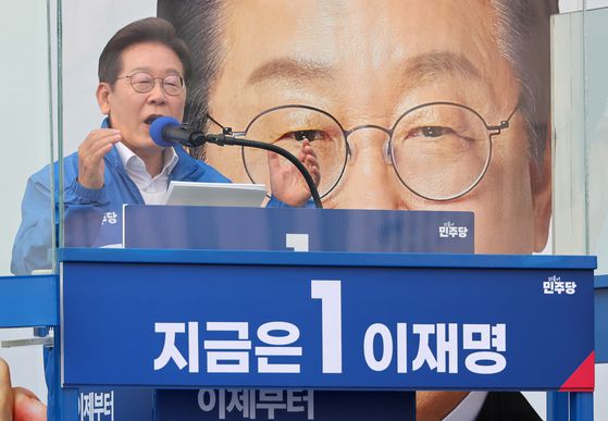 이재명 더불어민주당 대선 후보가 31일 세종시 나성동 나무그늘광장에서 선거 유세를 하고 있다. 김성룡 기자 |