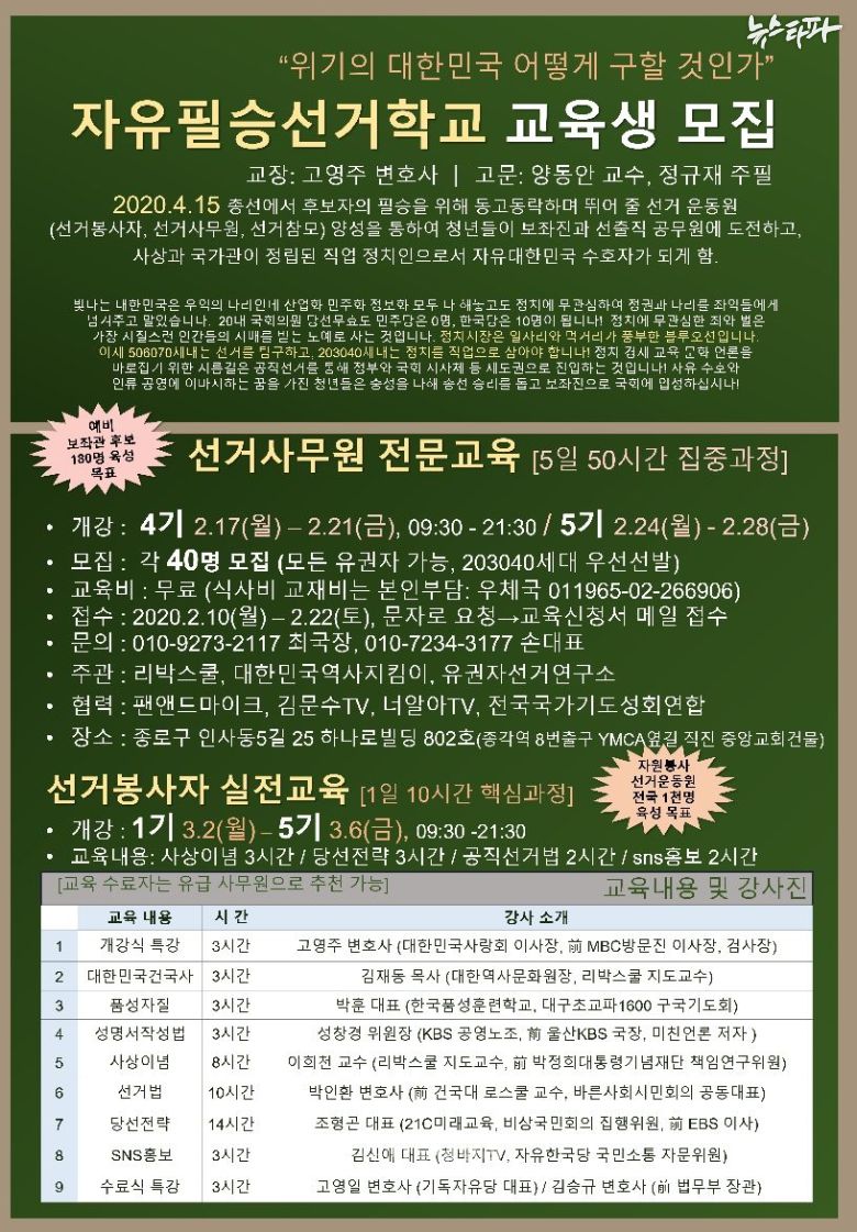 공고문에는 '4.15 총선에서 후보자의 필승을 위해 동고동락하며 뛰어 줄 선거운동원 양성을 통해 청년들이 보좌진과 선출직 공무원에 도전하고, 사상과 국가관이 정립된 직업 정치인으로서 자유대한민국 수호자가 되게 함'이라고 적혔다. 한마디로 자신들의 총선을 도울 자원봉사자를 뽑는단 얘기다.