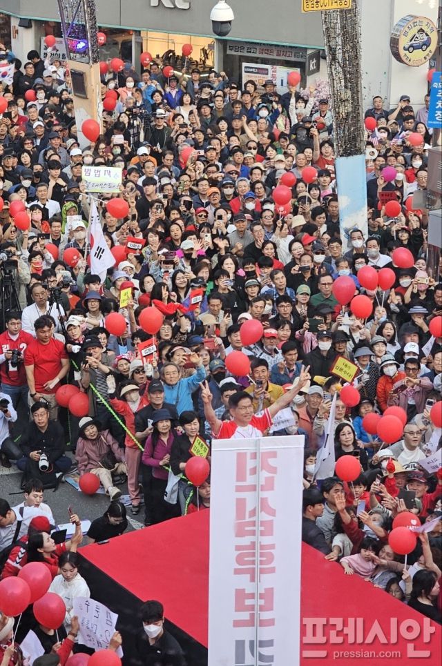 ▲김문수 국민의힘 대통령 후보가 31일 오후 경북 포항시 북포항우체국 앞에서 열린 집중 유세에서 시민들에게 인사하고 있다. ⓒ프레시안(오주호 기자) |