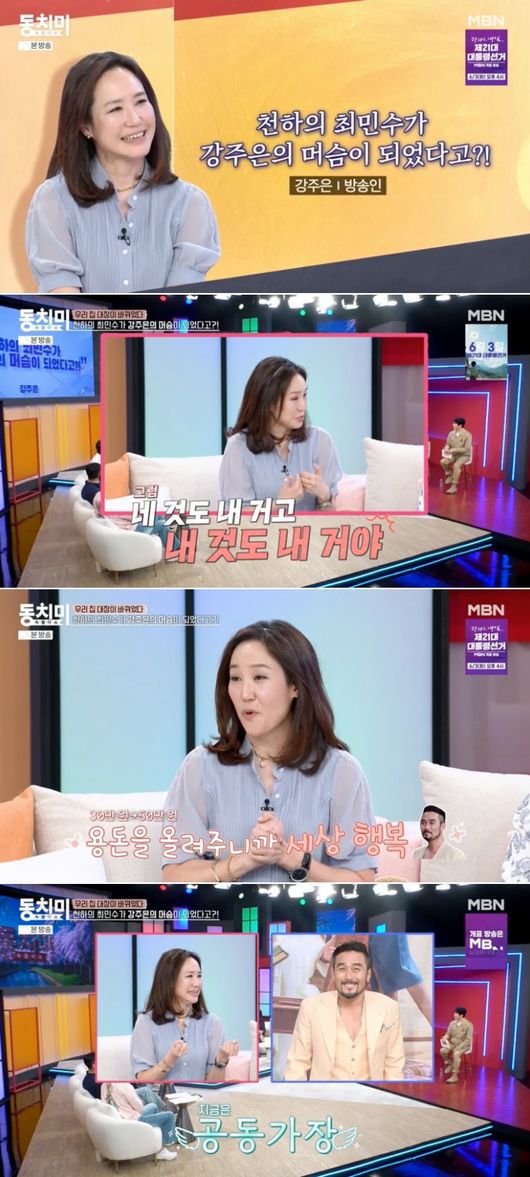 강주은은 "그렇게 제가 주부 생활 10년 동안 하다가 우리 아이 학교를 보낼 때 외국인 학교에 첫 직장이 생겼다. 수익에 대해 남편한테 물어봤다. 이 수익이 내 거고 자기 건 자기 거냐 물었다. 그랬더니 '아니다 내 것도 다 주은이 거'라고 해주더라. 거기서 ‘네 것도 내 거고 내 것도 내 거야’가 나왔다. 이제 항상 우리끼리 ‘이 것도 내 거지?’를 항상 확인하게 됐다"라며 웃었다.