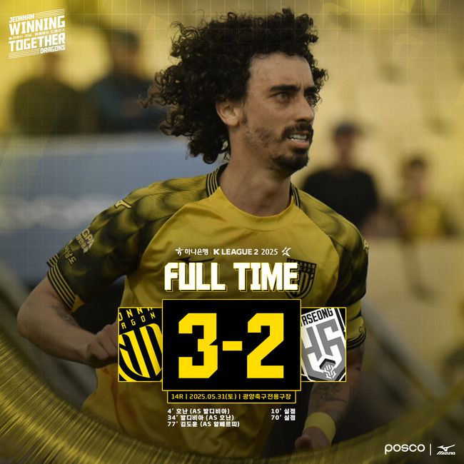 5월 31일 토요일 오후 4시 30분 광양축구전용구장에서 하나은행 K리그2 2025 14라운드로 열린 전남과 화성의 경기에서 전남이 3-2로 승리했다.