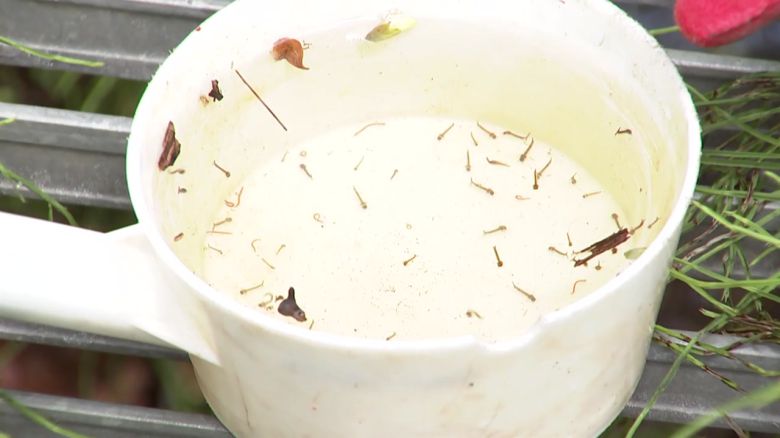 배수로의 빗물받이 맨홀을 들어 올리자 모기 유충인 장구벌레 수십 마리가 꿈틀거립니다.