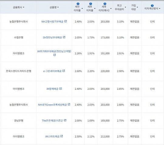 1일 금융감독원 금융상품통합비교공시에 따르면 은행 12개월 정기예금 가운데 최고 우대금리를 제공하는 상품은 농협은행의 ‘NH고향사랑기부예금’이다. 이 상품은 세전이자율 2.40%에 우대금리를 더해 최고 3.10%의 금리가 제공된다. 우대 조건은 ▲고향사랑기부금 납부고객 0.5%p ▲만 65세 이상 고령자 0.1%p ▲만 19~34세 MZ고객 0.1%p ▲고향사랑 특별금리 0.1%p 등이다. 고향사랑기부금 우대금리는 농협은행·농축협 영업점 또는 고향사랑e음 홈페이지를 통한 기부금 납부 실적이 확인되는 경우 적용된다.