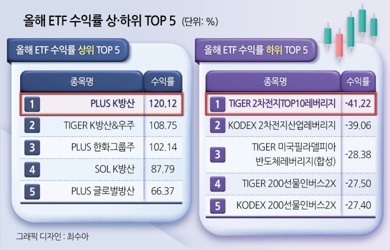 1일 한국거래소에 따르면 올해 ETF 수익률 상위권은 방산 업종이 싹쓸이했다. ▷PLUS K방산(120%) ▷TIGER K방산&우주(108%) ▷PLUS 한화그룹주(102%) ▷SOL K방산(87%) ▷PLUS 글로벌방산(66%)처럼 상위 5개 종목 중 4개 종목이 모두 방산업에 투자하는 ETF다.