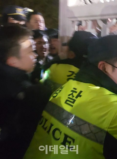 2024년 12월 3일 밤, 국회경비대 등 경찰이 시민들의 저항에도 불구하고 물리력을 동원해 국회 출입문을 차단하고 있다. (사진=이데일리)