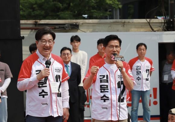 김문수 강릉 집중 유세 - 김문수(오른쪽) 국민의힘 대선 후보와 권성동 원내대표가 31일 강원 강릉시 중앙시장 월화거리 광장 집중 유세에서 지지를 호소하고 있다. 국민의힘 제공