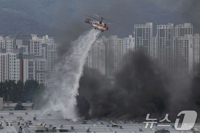 17일 오전 7시 11분 광주 광산구 소촌동 금호타이어 광장공장에서 화재가 발생해 소방당국이 소방헬기를 동원해 진화 작업을 하고 있다 2025.5.19/뉴스1 ⓒ News1 김태성 기자
