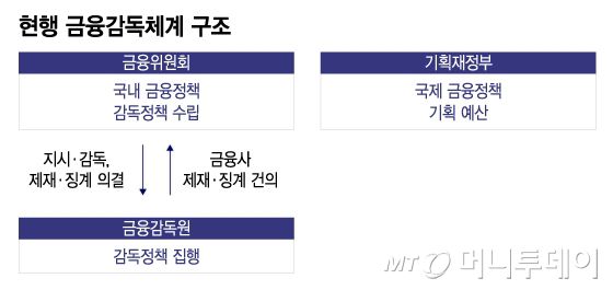 2008년 이명박 정부 때 만들어진 현행 금융감독체계는 당시 재정경제부의 국내금융정책 기능과 금융감독위원회의 금융감독 기능을 금융위원회로 통합한 결과다. 금감위에서 분리된 금감원은 검사와 제재 등 감독집행 기능을 수행하도록 금융위 아래에 뒀다.