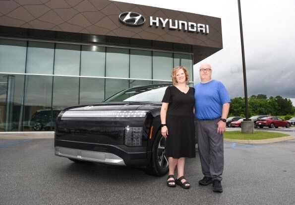 지난달 30일(현지시간) 미국 조지아주 링골드에 위치한 마운틴 뷰 현대 공장에서 제니퍼(왼쪽)·드웨인 메이너드 부부가 아이오닉 9를 인도받고 있다. (사진=현대차)