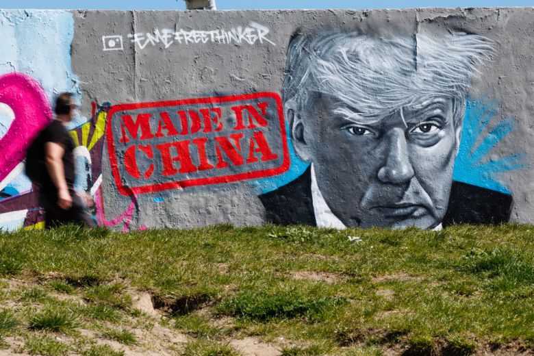독일 베를린에서 도널드 트럼프 대통령의 그림이 ‘메이드 인 차이나’라는 글귀 옆에 그려져 있다. [EPA] |