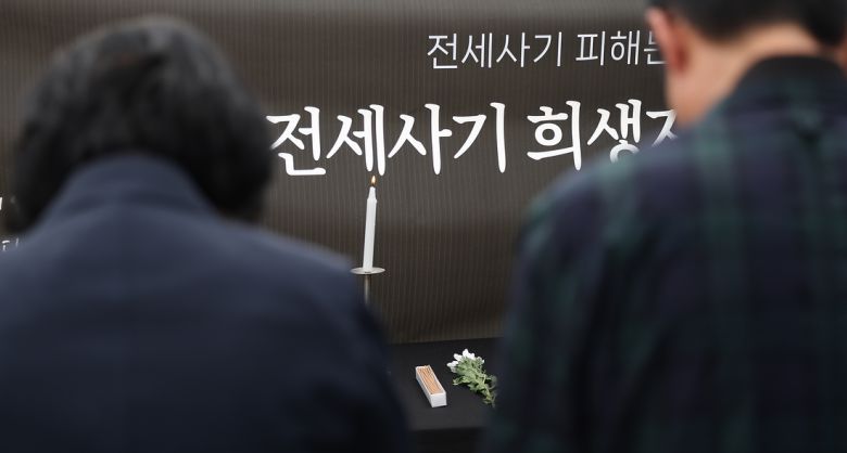 지난달 2일 대구 중구 동성로에 설치된 대구 전세사기 희생자 1주기 추모 분향소에서 전세사기·깡통전세 피해 대구 대책위원회, 전세사기 대구 피해자 모임 관계자들이 희생자를 추모하며 묵념하고 있다. 연합뉴스