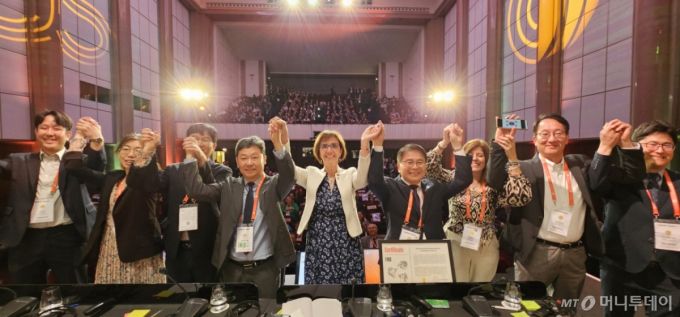 지난 달 29일 프랑스 파리에서 열린 WOAH(세계동물보건기구) 제92차 정기총회에서 '제주도 구제역 백신접종 청정지역 인증'을 획득한 한국 수석대표 최정록 농식품부 방역정책국장(사진 오른쪽에서 4번째)이 에마뉘에 수베항 WOAH 사무총장(오른쪽 5번째) 등 관계자들과 함께 두 손을 들어 기뻐하고 있다./사진=정혁수 기자
