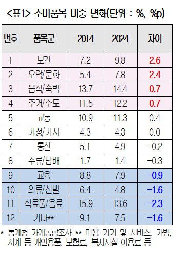 반면 △식료품·음료(-2.3%p) △의류·신발(-1.6%p) △교육(-0.9%p) 등 전통적인 지출 항목은 축소됐다. 1인 가구의 증가, 가정 간편식 보편화, 저출산에 따른 학생 수 감소 등이 영향을 미친 것으로 풀이된다.