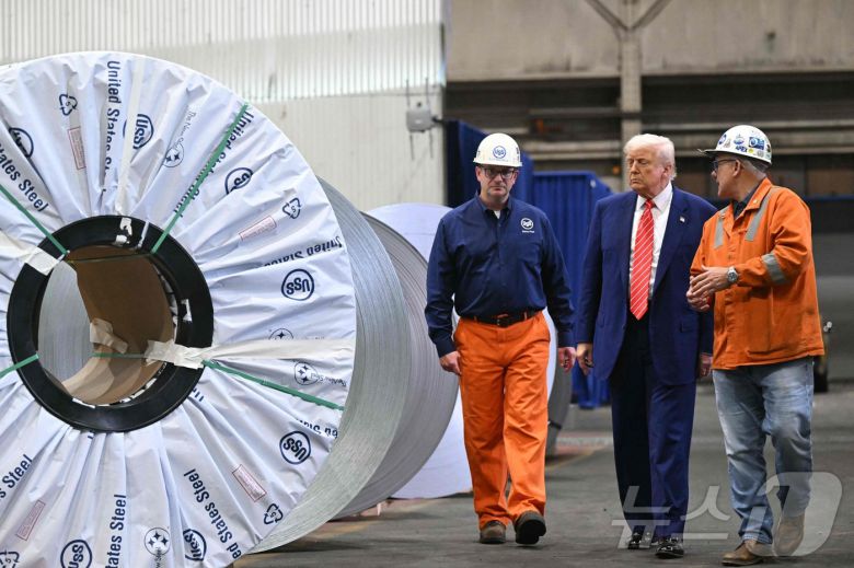 도널드 트럼프 미국 대통령이 지난 30일(현지시간) 펜실베이니아주 웨스트미플린에 위치한 US스틸 어빈제철소를 방문해 공장을 둘러보고 있다. 2025..5.31 ⓒ AFP=뉴스1 ⓒ News1 류정민 특파원
