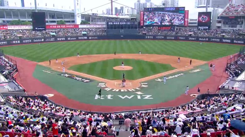 수원 KT위즈파크 외야 관중석 뒤쪽 벽을 때린 대형 솔로 홈런.