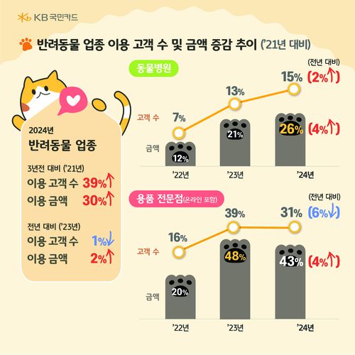 1일 KB국민카드가 2021년부터 지난해까지의 고객 결제 데이터를 분석해 반려동물 업종의 소비 트렌드를 분석한 결과를 발표했다. 최근 4년간 반려동물 업종(동물병원, 용품 전문점) 이용 경험이 있는 354만명의 결제 데이터 2485만건을 기반으로 이뤄졌다.