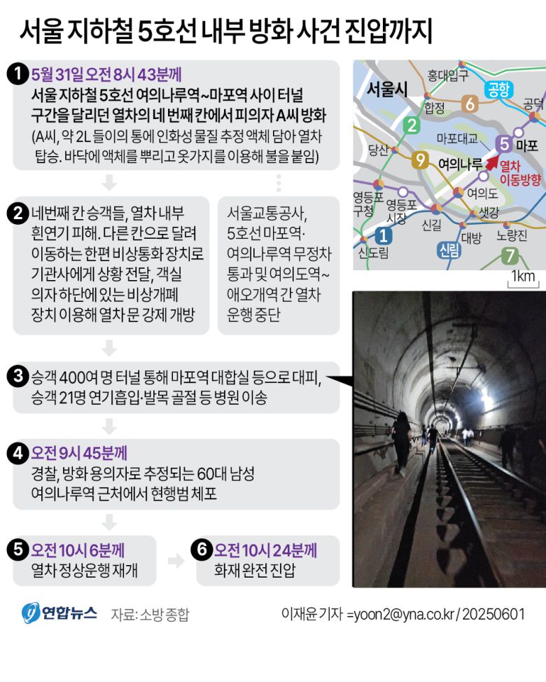 서울지하철 5호선 열차 안에서 지난 5월 31일 방화로 인해 승객들이 지하 터널을 통해 대피하는 사건이 발생했다. 사진은 화재로 인해 대피하는 승객들의 모습. 영등포소방서 제공 |