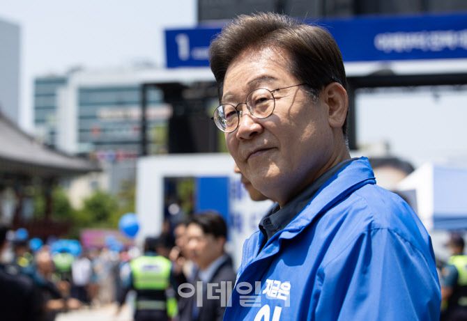 이재명 더불어민주당 대통령 후보가 1일 오전 경북 안동시 용부공원에서 열린 유세를 마친 후 백브리핑 장소로 향하고 있다.(사진=뉴스1)