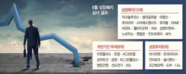 한국거래소 기업심사위원회 등이 올해 들어 5월까지 퇴출을 통보한 상장사가 34개사로 1년만에 두 배 이상 늘어난 것으로 나타났다. 해당기업들이 강하게 반발하면서 실제 퇴출까진 시간이 걸리지만 내년 상장폐지 요건 강화 움직임과 맞물리면서 시장 체질 개선이 이뤄질 것이란 기대감도 커지고 있다.