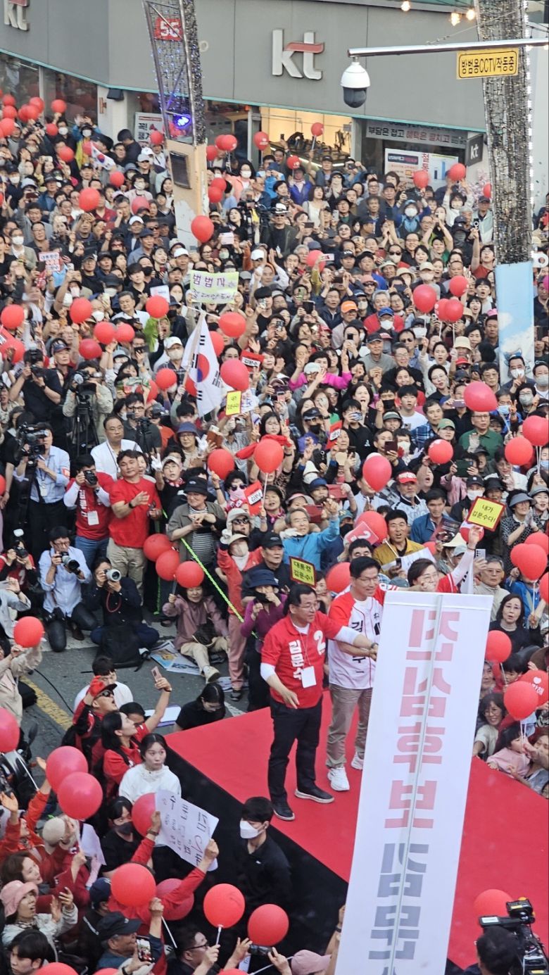 이날 유세에는 국민의힘 경북선대위 경주본부 선대위원장을 맡고 있는 김석기 국회의원을 비롯 선대위 관계자들과 국민의힘 소속 도·시의원, 당원, 시민 등 약 5000여 명이 함께하며 발 디딜 틈이 없는 인산인해를 이뤘다.