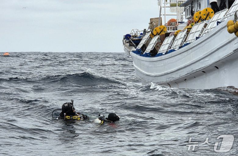 1일 경북 포항해양경찰서 스쿠버 요원들이  독도 해상에서  스크류에 로프가 감겨 표류 중인 A  호(30톤급) 구조에 나서고 있다. (포항해양경찰서제공, 제판매 및 DB 금지) 2025.6.1/뉴스1