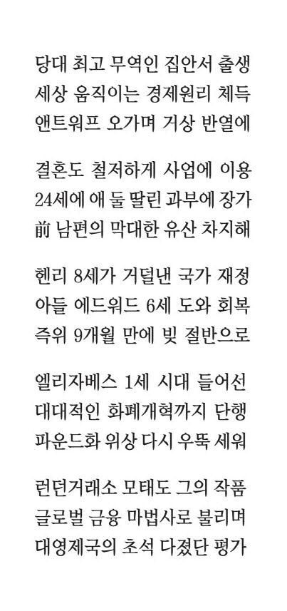 새 신부의 돈을 빼돌린 잔혹한 남자의 이름은 토머스 그레셤. "악화가 양화를 구축(내쫓는다는 뜻)한다"는 그레셤의 법칙은 이 남자의 이름에서 따왔습니다. 동시에 잉글랜드를 세계적인 국가로 만든 사내이기도 했습니다. 사생활에서도, 공인으로서도 계산과 실리에 밝았기에 가능한 일이었습니다. 잔혹한 성정이 세계 경제를 이끈 동력이라는 역설. 오늘의 이야기가 전하는 메시지입니다.