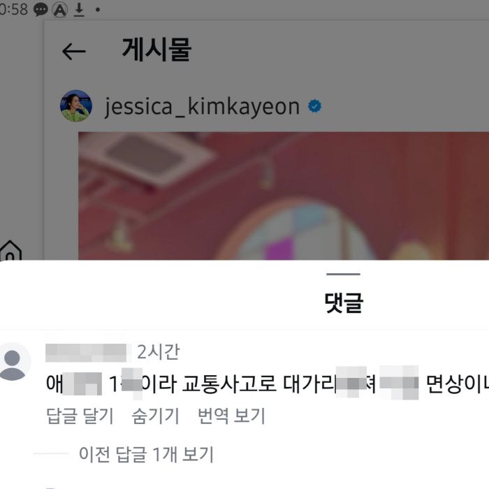 사진은 자신의 개인계정에 달리 악플을 캡처한 모습. 댓글에는 '애새X 1X이라 교통사고로 대가리깨져 X질 면상'라며 악담을 퍼붓고 있다. 이는 김가연은 이날 이재명 더불어민주당 대통령 선거 후보의 충북 충주 유세에 참석해 지지연설을 한 후 달린 것이다.