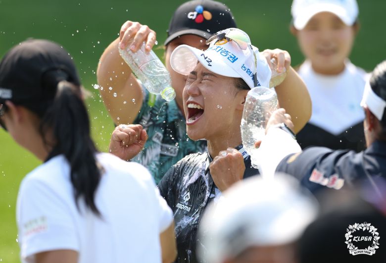 정윤지(가운데)가 1일 경기도 양평 더스타휴 골프 앤 리조트에서 열린 KLPGA 투어 Sh수협은행 MBN 여자오픈 우승을 확정한 뒤 동료 선수들에게 축하 물 세례를 받으며 환호하고 있다./KLPGA |