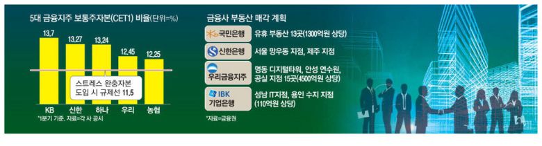 현재 5대 금융지주(KB·신한·하나·우리·NH농협금융)는 보통주자본 비율이 규제 기준인 9%보다 높은 상황이다. 하지만 주요 은행과 금융지주는 연말 금융당국이 스트레스완충자본을 도입해 규제선을 11.5%까지 높일 것에 대비하고 있다. 까딱하다간 제재 대상이 된다는 위기감에 선제적으로 부동산부터 내다 팔고 있는 것이다. 보통주자본을 과할 정도로 쌓아두는 게 안전하다는 공감대도 퍼지고 있다. 한 금융지주 관계자는 "경기 침체가 장기화하며 금융그룹이 인수·합병(M&A) 시장에서 역할을 해줘야 하는 상황인데 모두 보통주자본 비율을 맞추느라 적극적으로 나서지 못하고 있다"면서 "유휴 부동산 매각을 통해 이 비율을 안전선까지 높이면 투자에 여력이 생길 것"이라고 전했다.