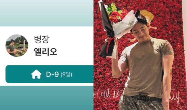 해당 사진에는 "병장 엘리오"라는 이름과 함께 "D-9"라는 숫자가 적혀 있다. 이는 뷔의 전역일 까지 9일이 남았다는 의미. 뷔는 이를 캡처해 올리며 전역을 앞둔 들뜬 마음을 드러낸 것으로 보인다.
